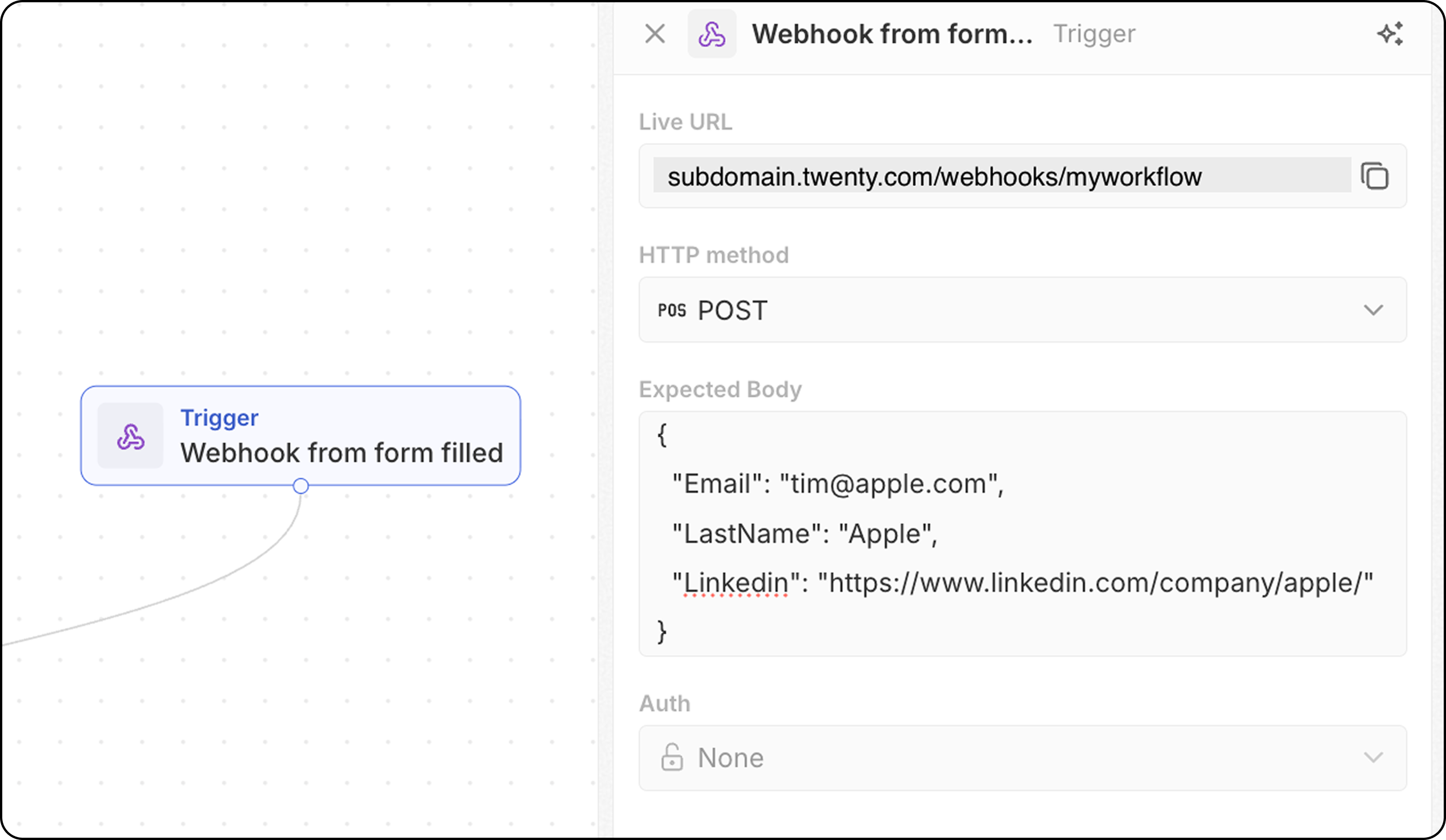 - POST istekleri için, Twenty’nin hangi verileri bekleyeceğini bilmesi amacıyla beklenen gövde yapısını tanımlayın. Buraya, iş akışınızda aşağıda gerekli olacak ve alacağınız alanları ekleyin.