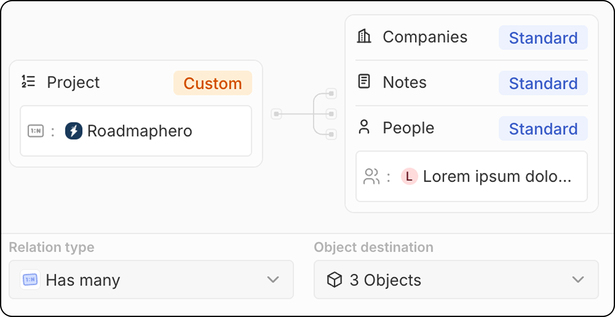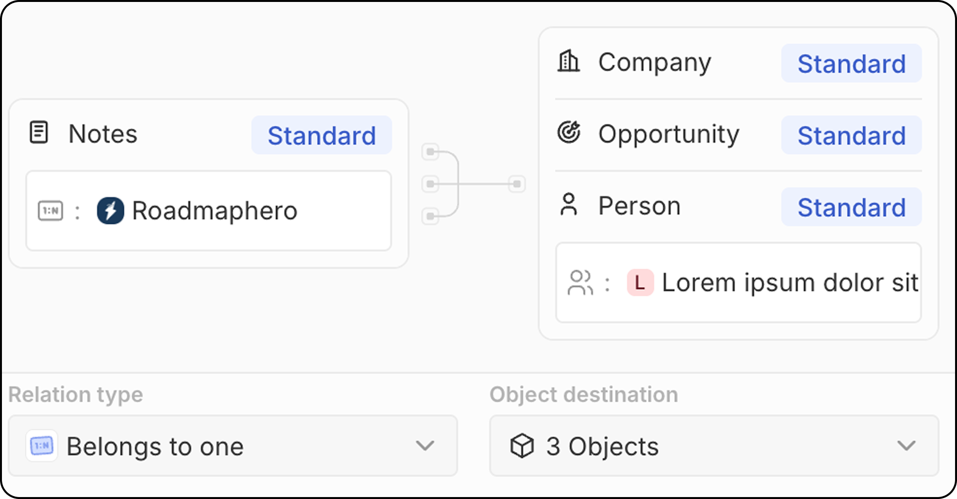 Some relations can connect to different types of objects. This works in two ways: Pattern 1: Many records linking to one record each from different object types Several Notes, Tasks, or Activities can each be attached to multiple object types at once:- Notes can be linked to one Person, one Company, and one Opportunity simultaneously