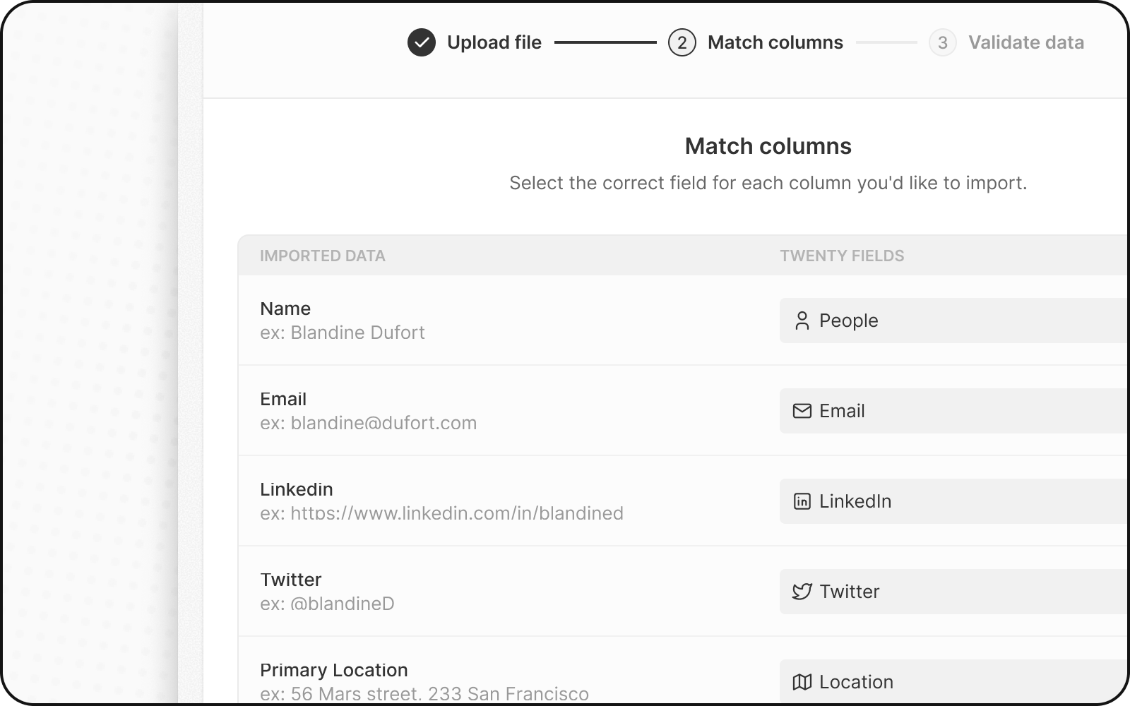 Consuelo automatically tries to match your columns to fields. Review and adjust:- Check automatic mappings — verify they’re correct