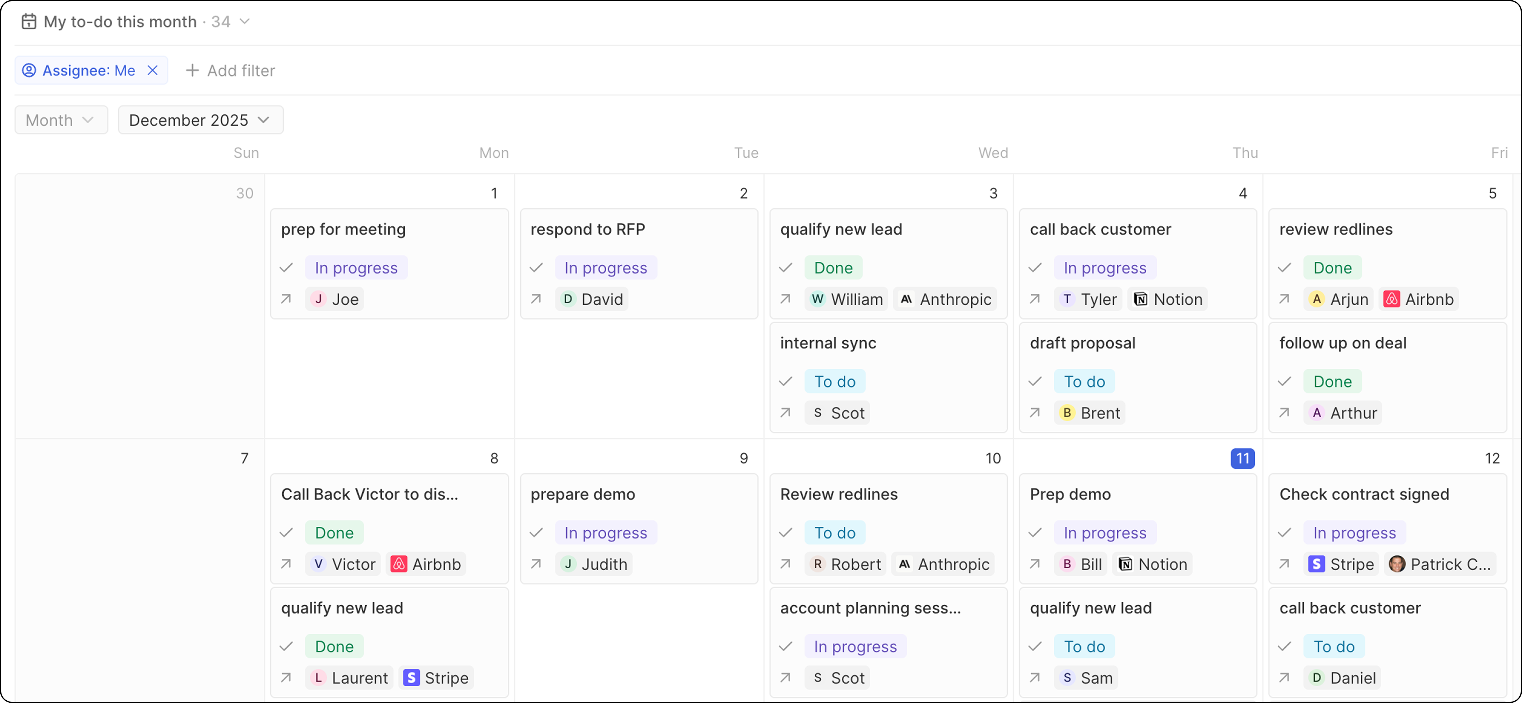Calendar view displays your records on a calendar based on a date field. Each record appears as an event on the corresponding date.
