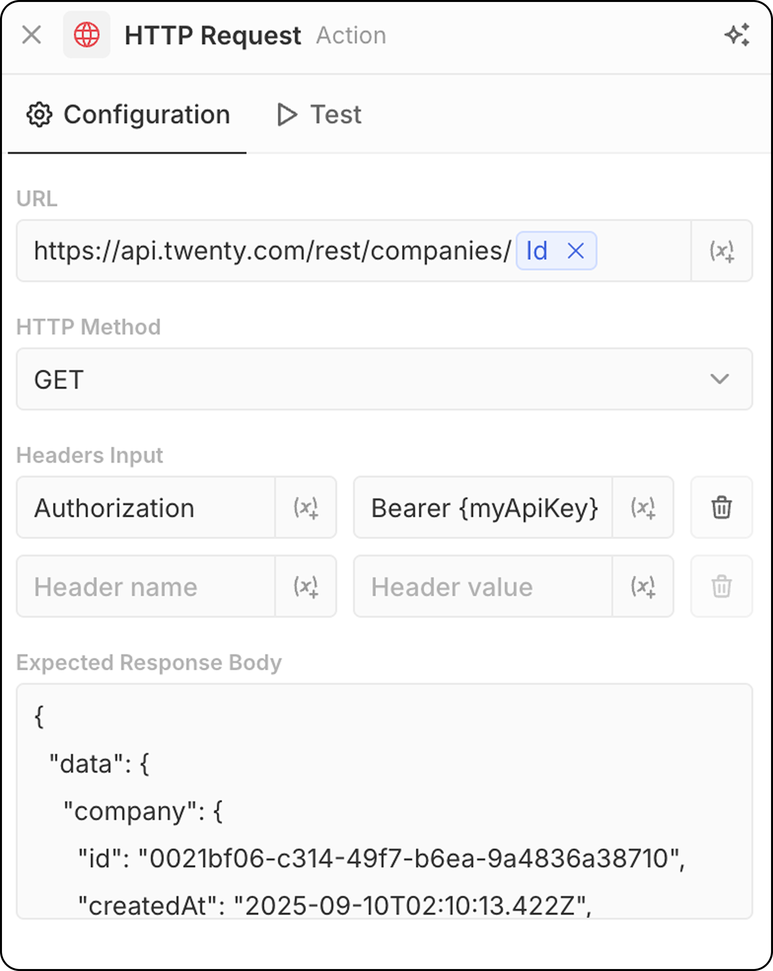 - Enter the API endpoint URL. Using parameters from previous steps is possible.