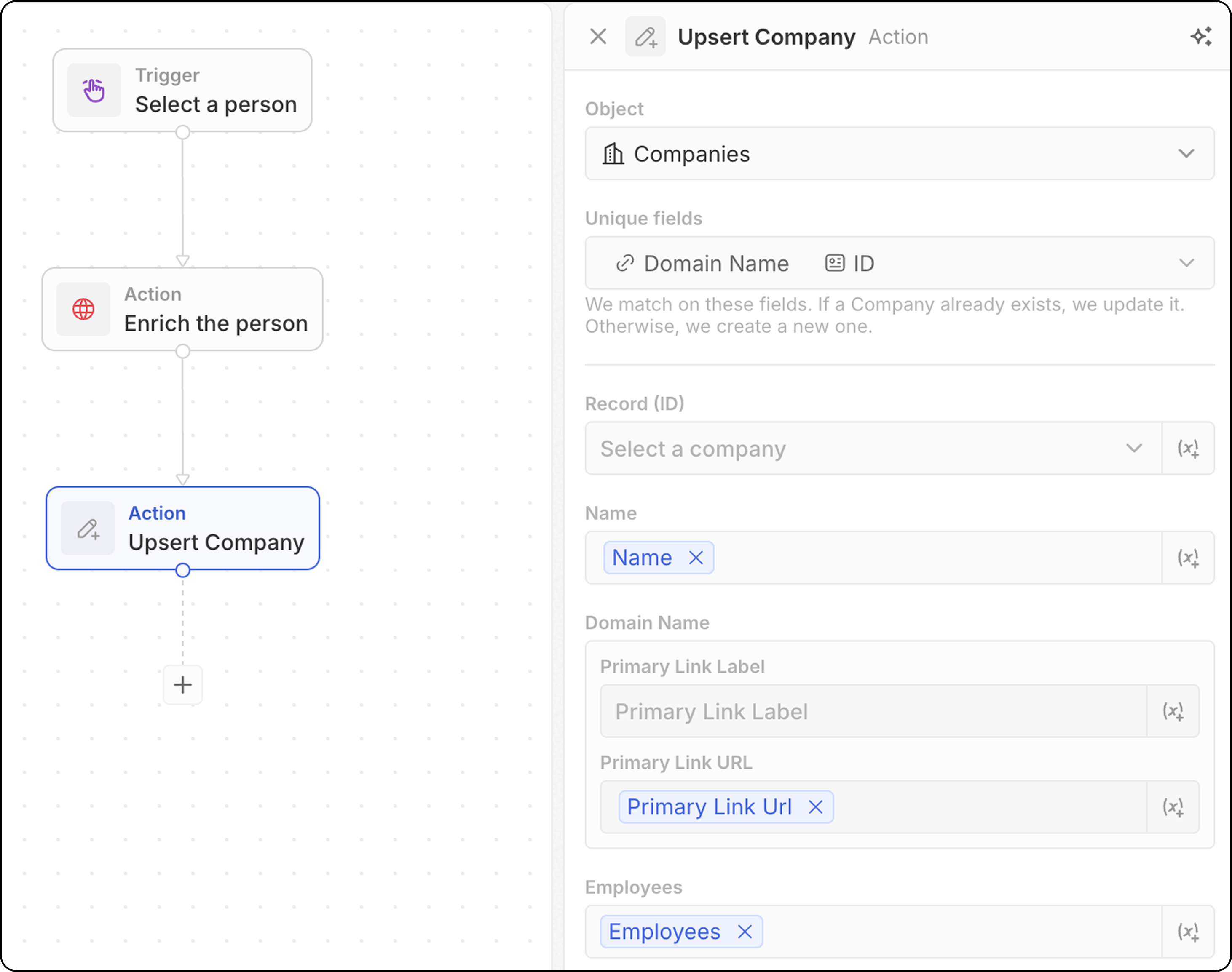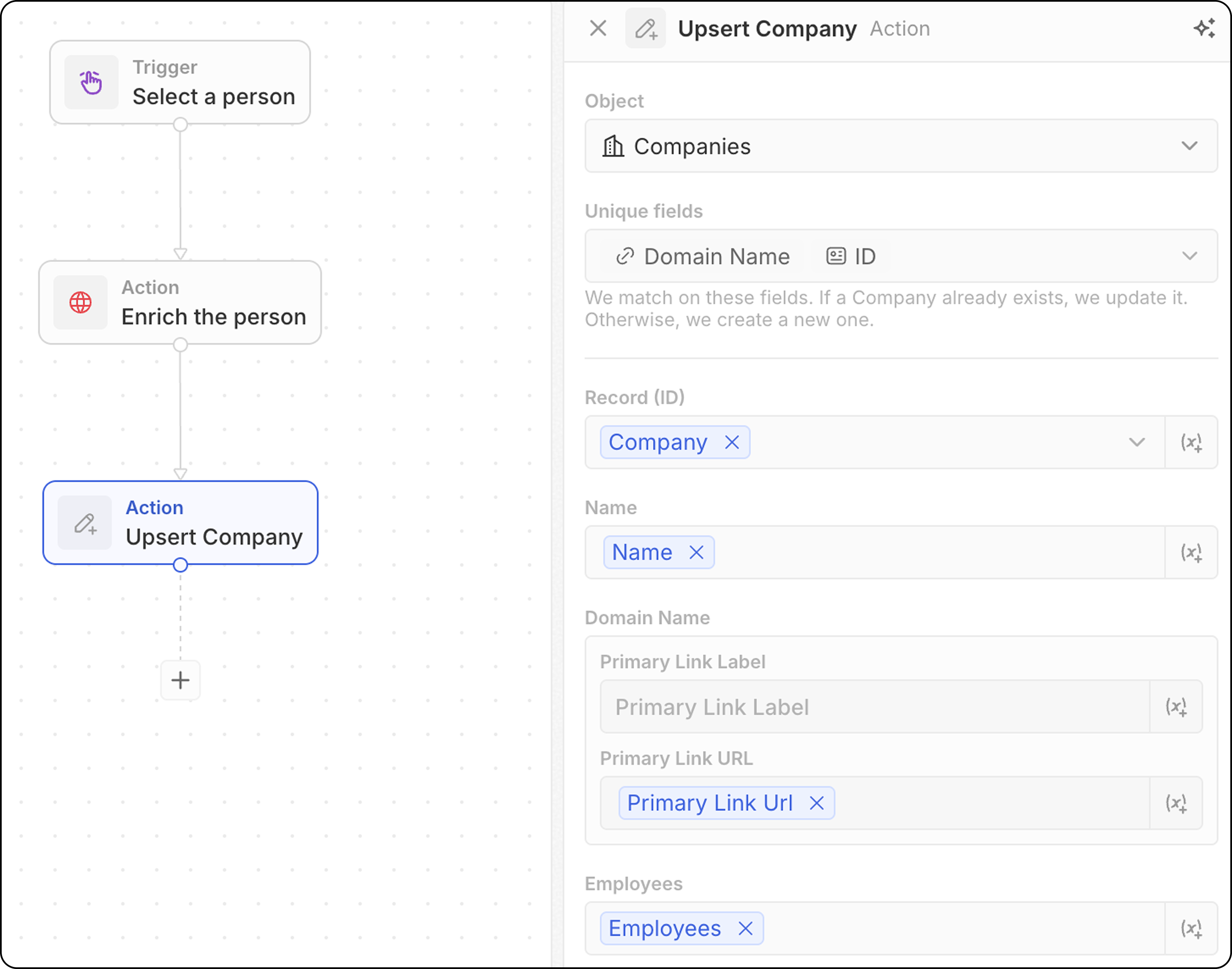 - Note which fields can be used for matching: email for People, domain for Companies, ID for any object, or any field marked as Unique. You’ll need to populate at least one of these below.